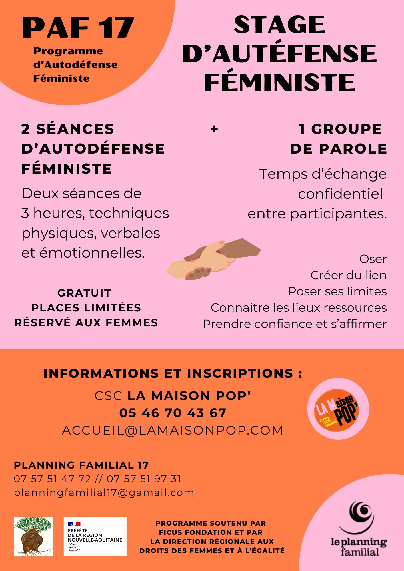 C’est donc avec grand plaisir que nous accueillons l’association du Planning Familial 17 pour l’animation d’un stage d’autodéfense féministe. Ces ateliers d’autodéfense féministe alternent jeux de rôle, exercices corporels, temps collectifs de réflexion et de discussion. Si la défense physique est un élément important, les ateliers se focalisent sur la manière de mettre un terme aux différentes formes de violences le plus tôt possible. Idéalement, avant qu’une intervention physique soit nécessaire.