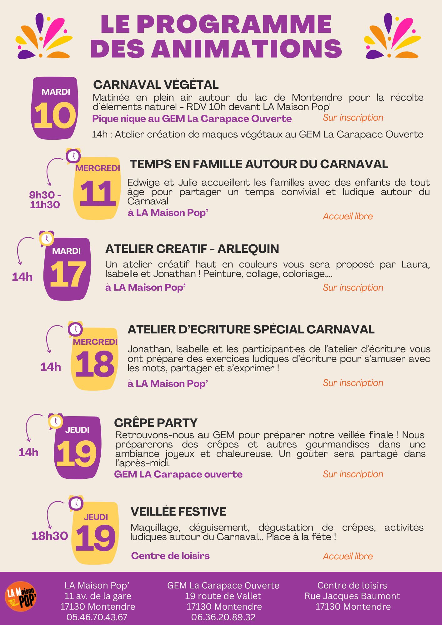 Le voici le voilà : le programme des animations des vacances de février ! Ces vacances seront une parenthèse festive et intergénérationnelle sur le thème du CARNAVAL !  Il y en aura pour tout le monde : les familles, les adultes, les ados, les enfants,… Balade, ateliers créatifs, atelier d’écriture, temps d’accueil des familles, veillée festive, tout vous est présenté sur le support en pièce jointe.
