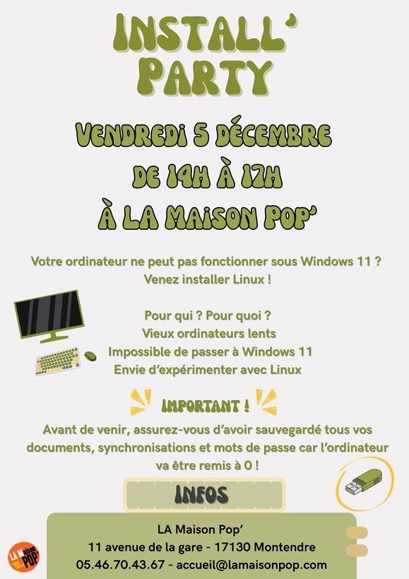 Install Party – Accompagnement par les bénévoles du Repair Café pour pouvoir continuer à utiliser le matériel informatique qui ne peut pas fonctionner avec Windows 11 . Information importante : faire une sauvegarde externe des documents, photos, etc car chaque ordi sera réinitialisé.