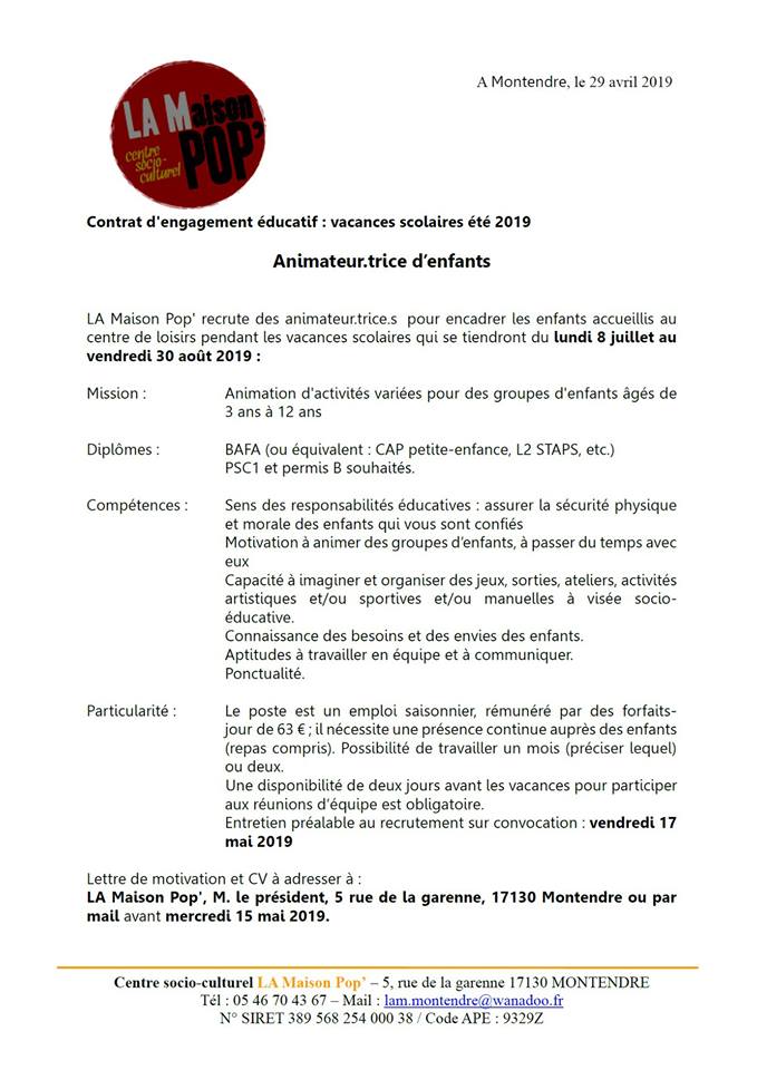 Merci d’adresser lettre de motivation et CV au président de LA Maison Pop’, 5 rue de la garenne 17130 Montendre ou par mail :lam.montendre@wanadoo.fr avant le mercredi 15 mai 2019. Des entretiens préalables au recrutement auront lieu vendredi 17 mai 2019, sur convocation.