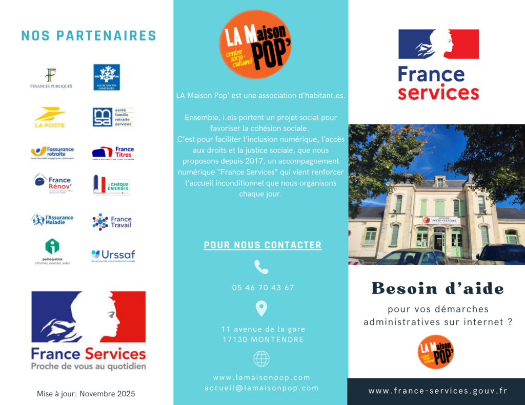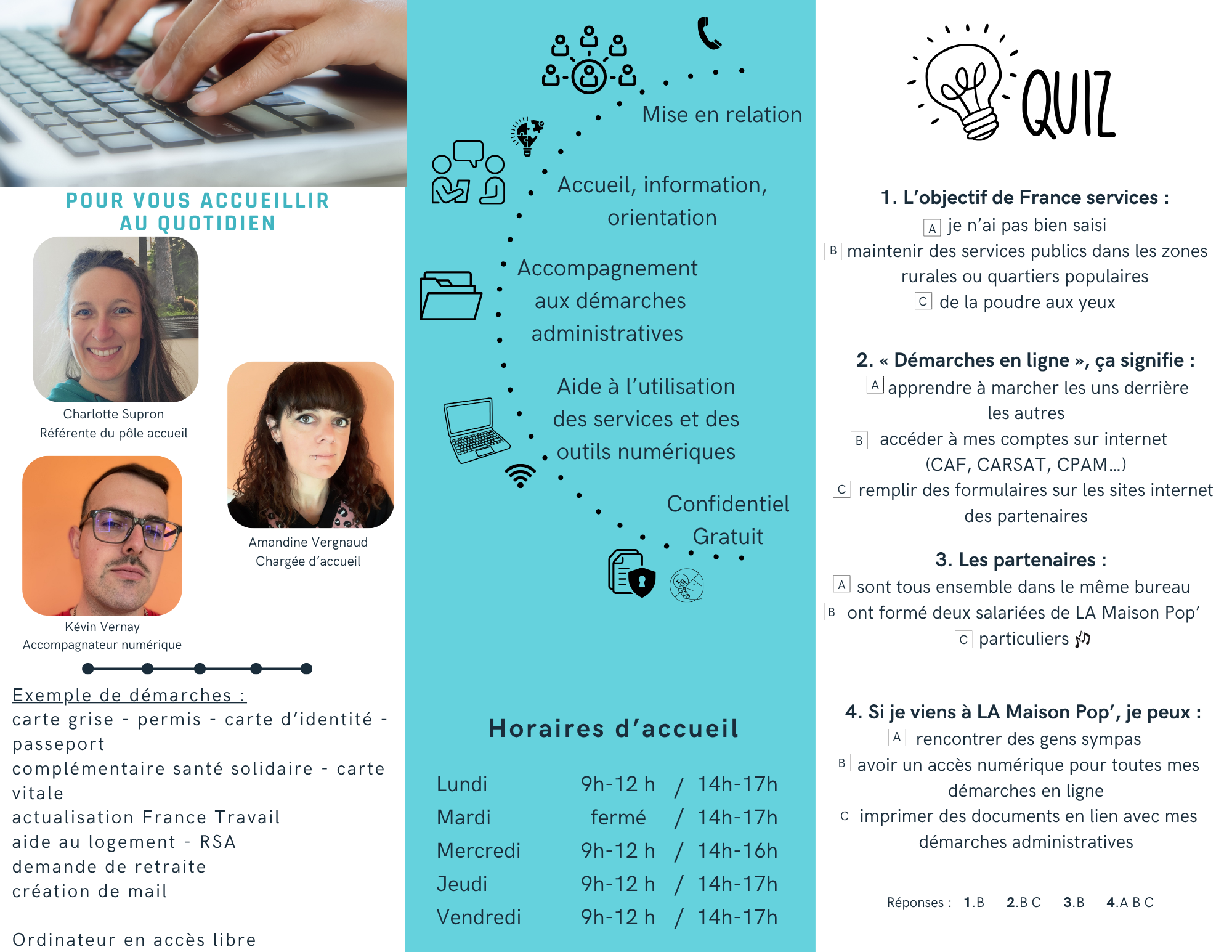 LA Maison Pop’ est labellisée France Services depuis janvier 2020. Océane Garcia, accompagnatrice numérique et Amandine Vergnaud, chargée d’accueil à LA Maison Pop’ vous accueillent et vous accompagnent dans vos démarches dématérialisées du quotidien, en prenant en compte les capacités de chacun·e et le respect de la dignité des personnes. C’est avec elleux et non pour elleux que nous travaillons. C’est avec ce principe ancré dans notre fonctionnement que nous avons mis en place notamment un double écran tactile, que nous accompagnons étape par étape avec pédagogie et bienveillance…