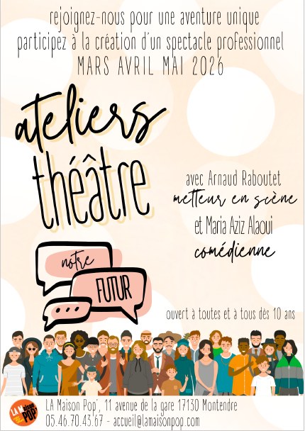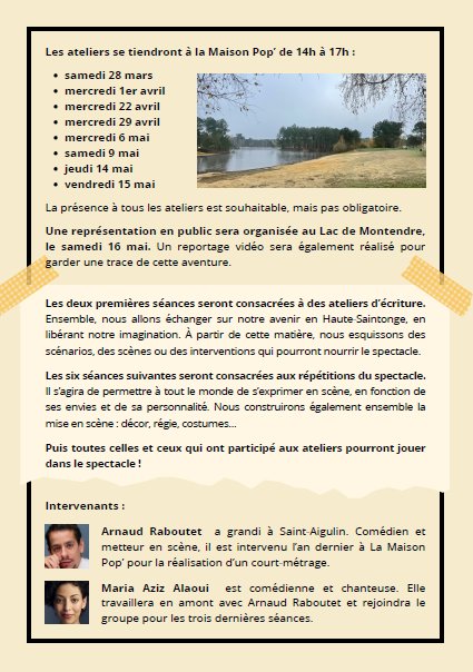 Les deux premières séances seront consacrées à des ateliers d’écriture. Ensemble, nous allons échanger sur notre avenir en Haute-Saintonge, en libérant notre imagination. À partir de cette matière, nous esquissons des scénarios, des scènes ou des interventions qui pourront nourrir le spectacle. Les six séances suivantes seront consacrées aux répétitions du spectacle. Il s’agira de permettre à tout le monde de s’exprimer en scène, en fonction de ses envies et de sa personnalité. Nous construirons également ensemble la mise en scène : décor, régie, costumes… Puis toutes celles et ceux qui ont participé aux ateliers pourront jouer dans le spectacle !